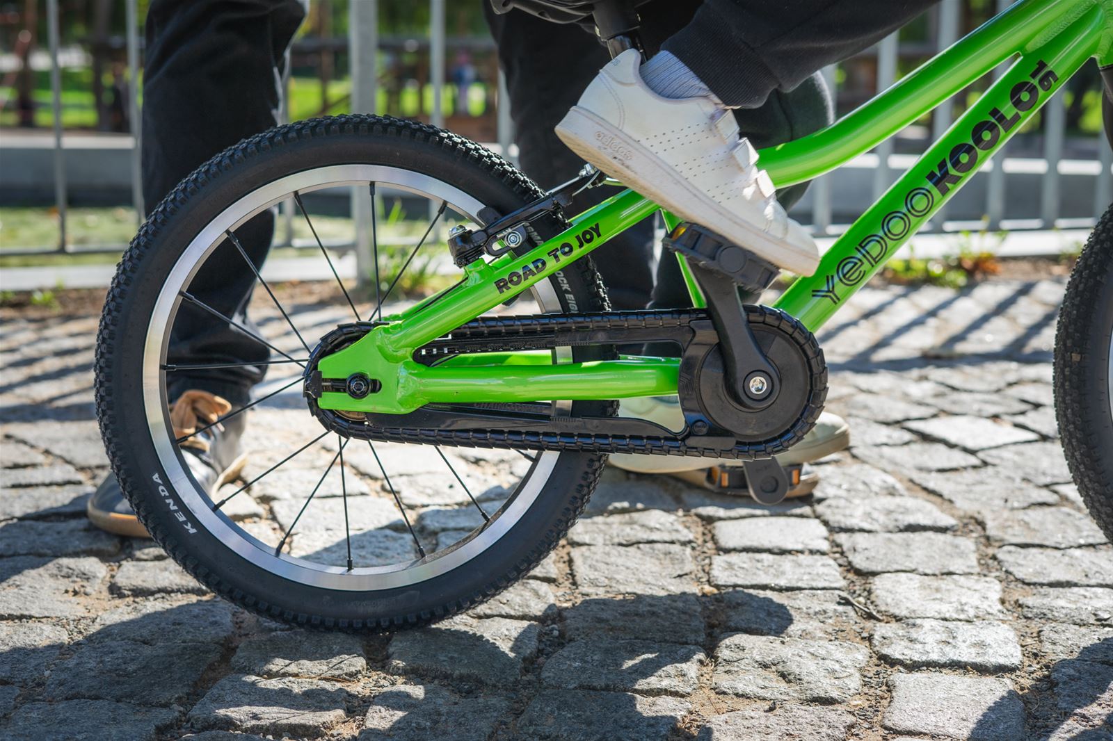 Koolo 16", zaprojektowany dla młodszych dzieci, wyposażony jest w węższą osłonę łańcucha, która zapewnia bezpieczną jazdę bez zwiększania jego gabarytów i wagi.