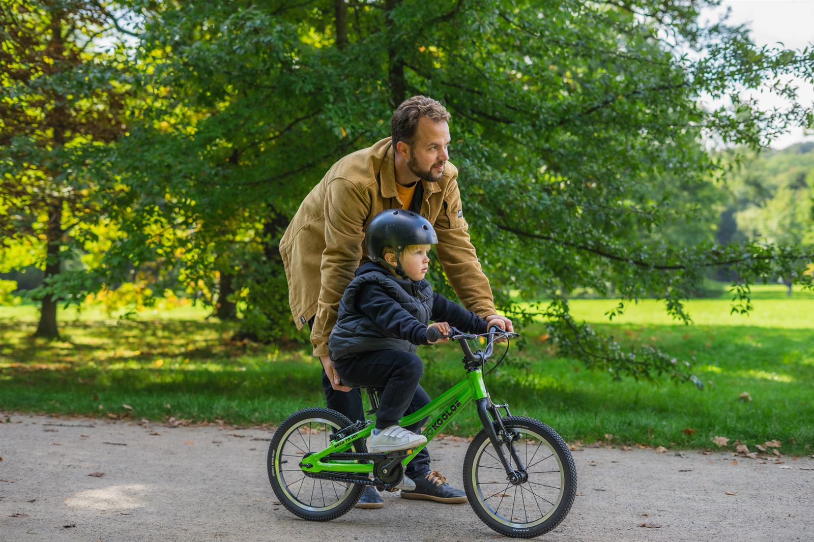 Koolo 16", zaprojektowany dla młodszych dzieci, wyposażony jest w węższą osłonę łańcucha, która zapewnia bezpieczną jazdę bez zwiększania jego gabarytów i wagi.