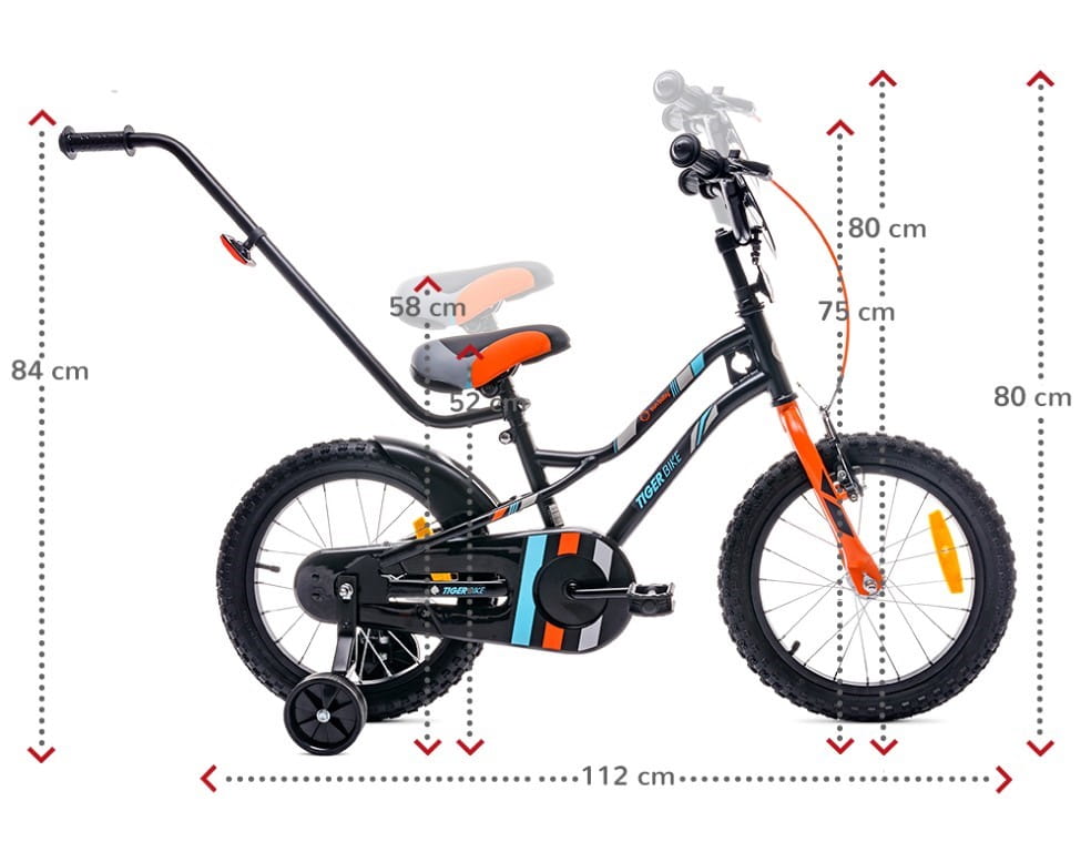 Rowerek Tiger Bike 16 cali w kolorze czarno-pomarańczowo-turkusowym. Wyposażenie obejmuje: błotnik tylnego koła, profilowane siodełko, odkręcane kółka boczne, osłonę łańcucha, hamulec przedniego koła, dzwonek.