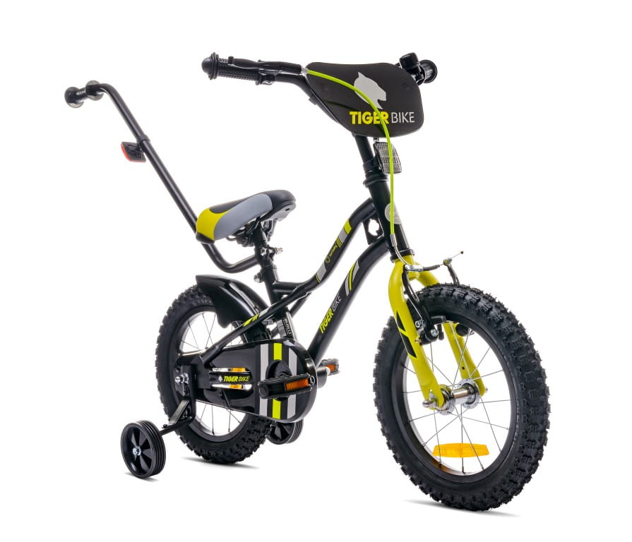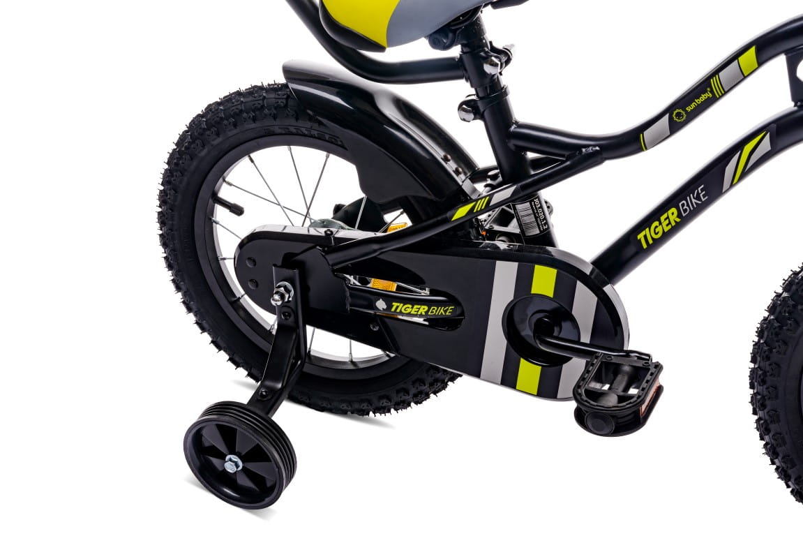 Rowerek Tiger Bike 16 cali w kolorze czarno-żółto-szary. Wyposażenie obejmuje: błotnik tylnego koła, profilowane siodełko, odkręcane kółka boczne, osłonę łańcucha, hamulec przedniego koła, dzwonek.