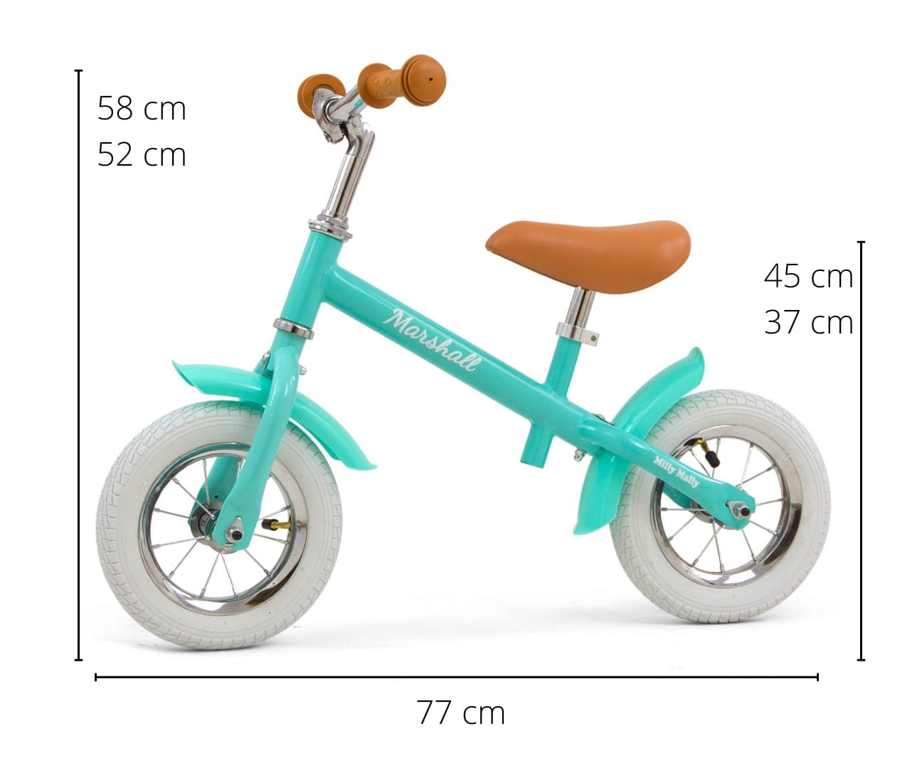 Wytrzymałe pompowane opony na białych felgach, miękkie i ciche przy jeździe. Ergonomiczne siodełko z miękkim wypełnieniem oraz możliwością regulacji wysokości sprawia, że rowerek rośnie razem z dzieckiem. Marshall posiada łożyskowaną skrętną kierownicę z możliwością regulacji wysokości. Antypoślizgowe, miękkie gumowe rączki zapewniają pewny chwyt i wygodne prowadzenie. Klasyczna i ergonomiczna konstrukcja rowerka zapewnia trwałość i wygodę użytkowania. Stalowa rama rowerka zapewnia większą odporność na przeciążenia. Rowerek dostosowany do długotrwałej eksploatacji przez najmłodszych.